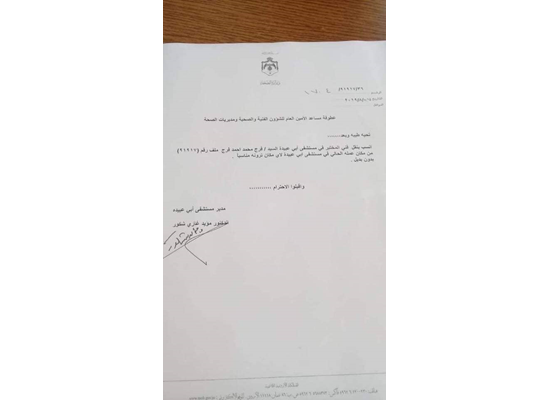 مدير مستشفى أبو عبيدة صورة قاتمة للأردن تنمر على فني المختبر فرج الصقور الذي دفعته حميته لإخبار وزير الصحة د. سعد جابر خلال زيارته للمستشفى عن المصاعب التي يواجهها العاملون في القسم وبالتأكيد المراجعين .