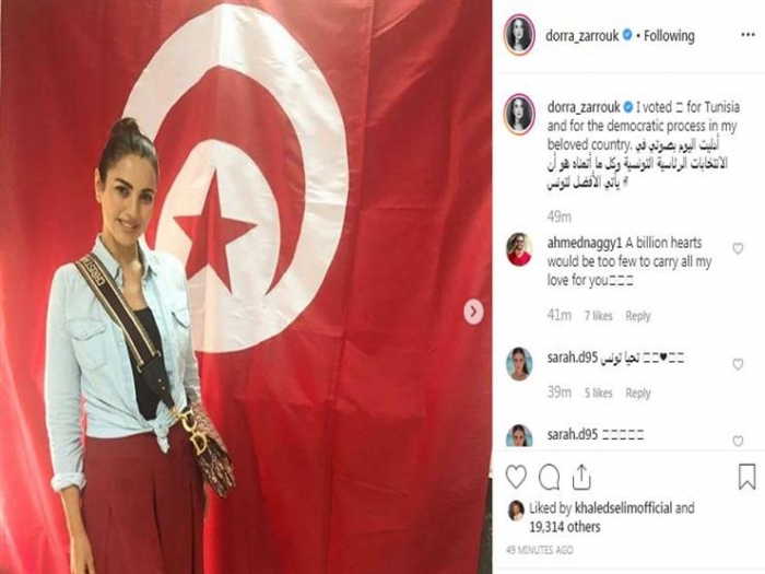 ونشرت الممثلة التونسية، درة زروق، صورةً لها مع العلم التونسي، وعلّقت عليها "أدليت اليوم بصوتي في الانتخابات الرئاسية التونسية وكل ما أتمناه هو أن يأتي الأفضل لتونس".
