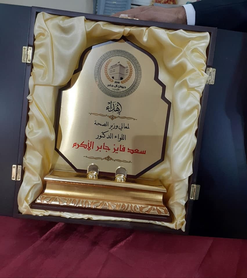 وفي نهاية الإحتفال قدم رئيس ديوان آل جابر محمد رفيق جابر درع الديوان إلى معالي الباشا والتقط أبناء العائلة صوراً تذكارية مع معالي الوزير وسط بهجة وسرور من الطرفين.
