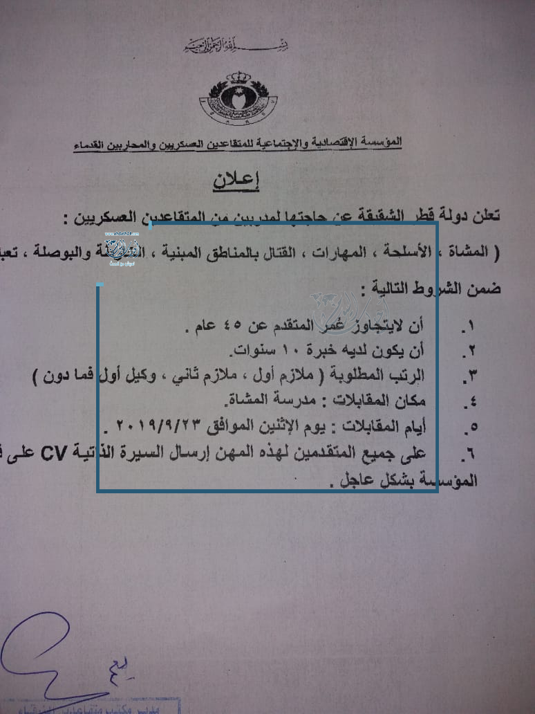 أحداث اليوم - تعلن دولة قطر عن حاجتها لمدربين من المتقاعدين العسكريين الاردنيين من (المشاة , الأسلحة , المهارات , القتال بالمناطق المبنية . الخارطة والبوصلة , تعبئة )