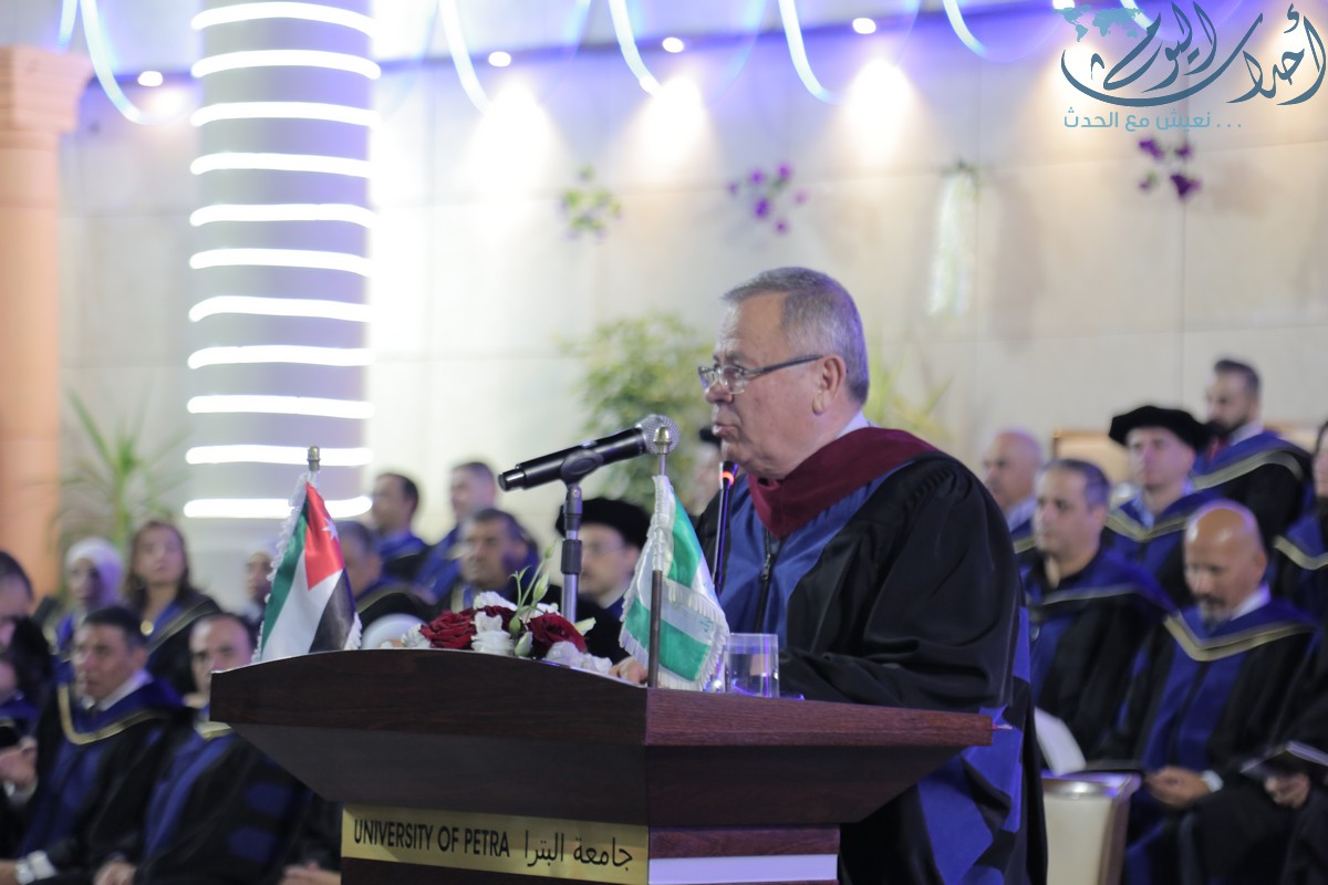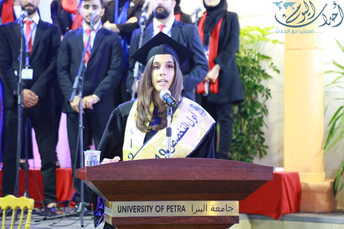 وألقى الطالب محمد الحمصي كلمة الخريجين في اليوم الأول قائلا "أعوامٌ تقاذفتنا عامً إلى عام قابلنا أخوةً لا يجودُ الدهرُ بأمثالِهِم، وقابلنا عُلماءَ لا نكترثُ إلى همٍّ أكثرَ من همِنا لوداعهم، أيتها الوجوهُ الطيبة أبأَءنا وأمهاتِنا وأخوانَنا وأساتذتَنا جامعتَنا، لقد أتى الغدُ البعيدُ فصارَ حاضراً وتخرجنا جامعة البترا التي رسَمَت اسَمها على جبينِ كلِّ واحدٍ فينا وِساماً من سؤدَدٍ وافتخار".