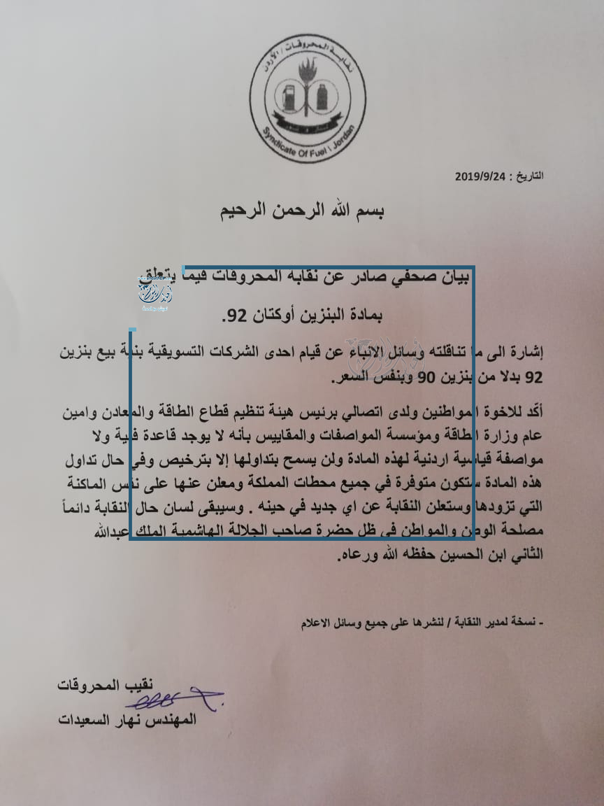 أحداث اليوم - أصدرت نقابة المحروقات الأردن بيانا حول بيع بنزين 92 بدلا من بنزين 90 وبنفس السعر.