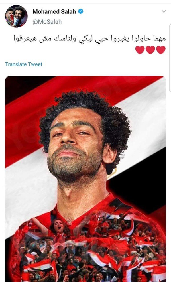 ونشر صلاح، صورة له على موقع التواصل الاجتماعي "تويتر" بقميص منتخب مصر مع ألوان علم مصر، معلقًا: "مهما حاولوا يغيروا حبي ليكي ولناسك مش هيعرفوا".