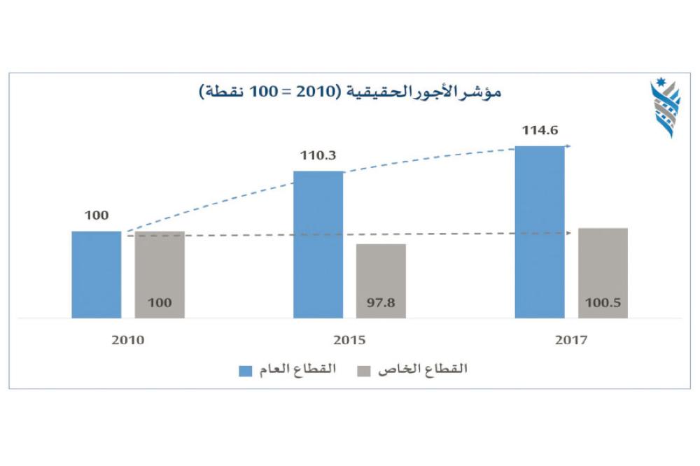 وبالنسبة للتغيرات في مؤشر الأجور الشهرية الحقيقية، الذي يأخذ معدل التضخم بعين الاعتبار، فقد ارتفع مؤشر متوسط الأجور الشهرية الحقيقية للقطاع العام إلى 6ر114 نقطة بحلول نهاية عام 2017، من 100 نقطة في عام 2010، فيما ارتفع مؤشر متوسط الأجور الحقيقية في القطاع الخاص إلى 5ر100 نقطة فقط في عام 2017، مقارنة مع 100 نقطة في عام 2010، ما يعني أن الزيادة الحقيقية في أجور العاملين في القطاع الخاص كانت محدودة جدا، حيث يظهر المؤشر استقرارا في نمو الأجور رغم أن المتطلبات المعيشية ازدادت خلال نفس الفترة.