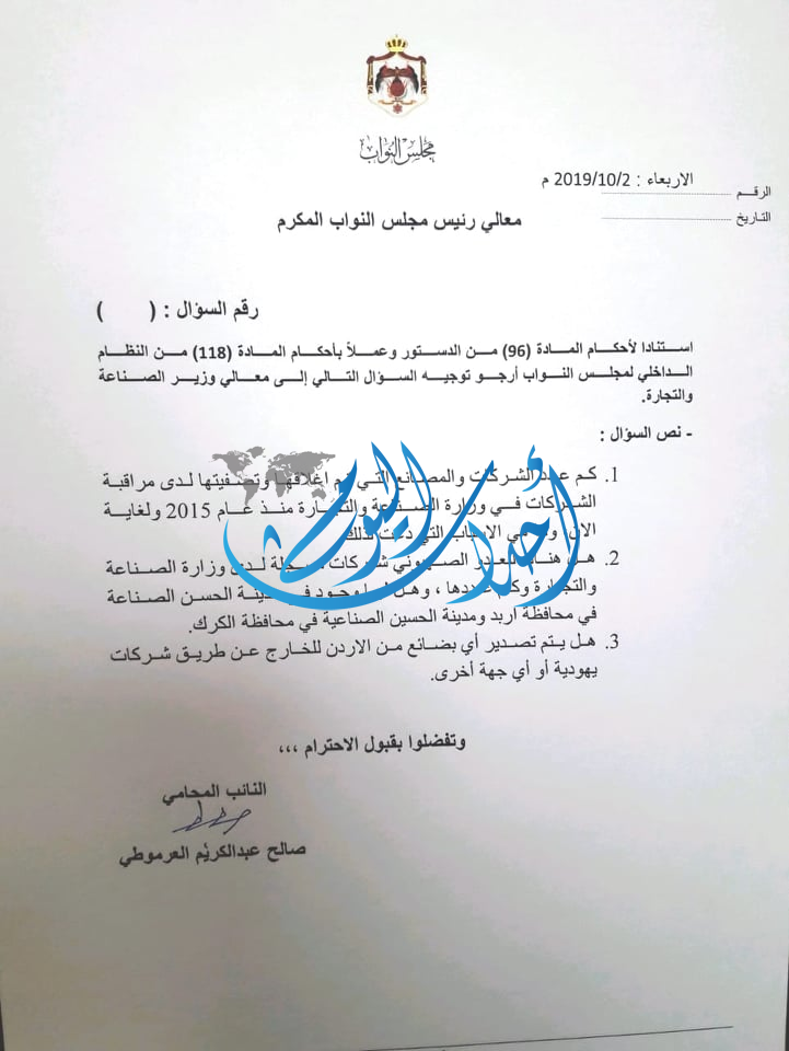 ووجه العرموطي سؤال آخر عما اذا كان هناك تصدير لأي بضائع من الاردن للخارج عن طريق شركات يهودية أو أي جهة أخرى، إضافة الى عدد الشركات والمصانع التي تم اغلاقها وتصفيتها لدى مراقبة الشركات في وزارة الصناعة والتجارة منذ عام 2015 ولغاية الان، وما هي الاسباب التي دعت لذلك.