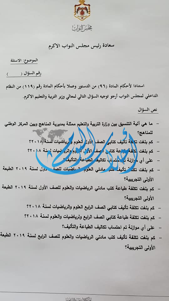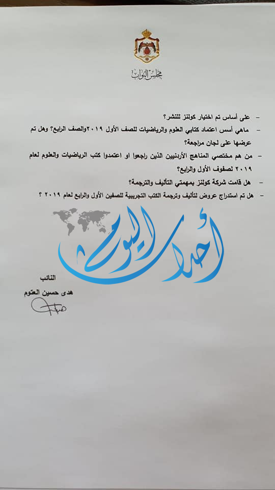 أحداث اليوم - أحمد الملكاوي - سألت النائب هدى العتوم وزير التربية والتعليم وليد المعاني عن تكلفة تعديل مناهج الرياضيات والعلوم لصفوف الأول والرابع الأساسيين وطباعتها الكتب والخبراء المشاركين في تأليفها ومراجعتها، مطالبة بالكشف عن المعايير التي تم اختيار شركة "كولنز" الإنجليزية لمهمات الترجمة والتأليف.