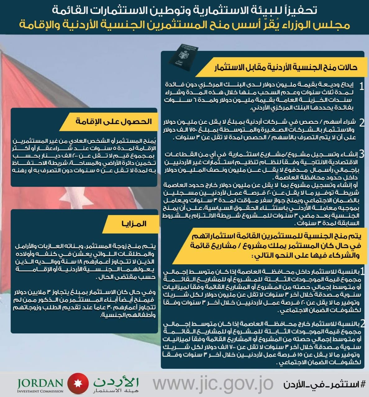 أو انشاء وتسجيل مشروع بما لا يقل عن مليون دولار خارج العاصمة، شريطة توفير ما لا يقل عن 20 فرصة عمل لأردنيين مسجلين بالضمان الاجتماعي ويمنح جواز سفر مؤقت لمدة 3 سنوات ويعامل بموجبه معاملة الأردني، باستثناء الحقوق السياسية، على أن يمنح الجنسية بعد مضي 3 سنوات للمشروع شريطة الالتزام بالشروط السابقة لمدة 3 سنوات.