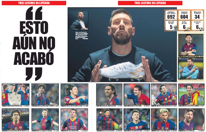 وأضافت: ”لا يزال ميسي البالغ من العمر 32 عاماً متعطشاً لتحقيق المزيد من الألقاب مع برشلونة، بعد أن توّج مع البلوغرانا بـ34 لقباً، من أهمهم 10 دوري، و4 دوري أبطال، و3 كأس العالم للأندية، و6 كأس ملك إسبانيا“.