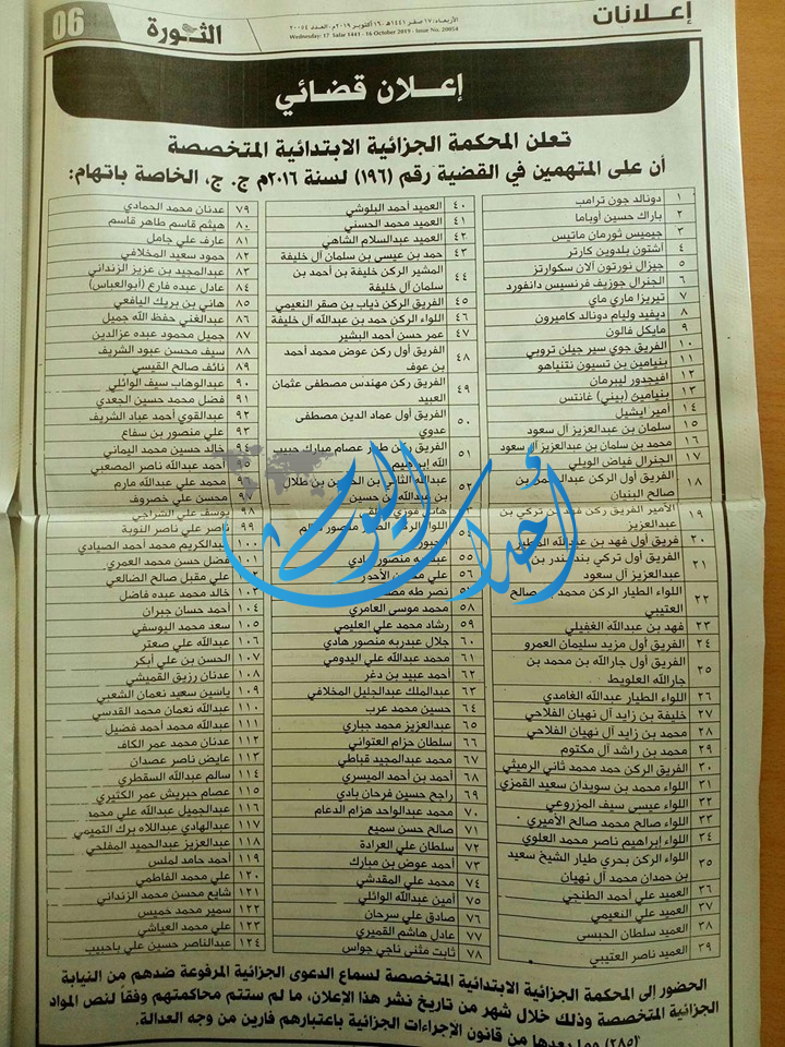 وأشار الإعلان إلى أنه في حالة عدم حضورهم سيتم محاكمتهم وفقاً لنص المواد من قانون الإجراءات الجزائية باعتبارهم فارين من وجه العدالة.
