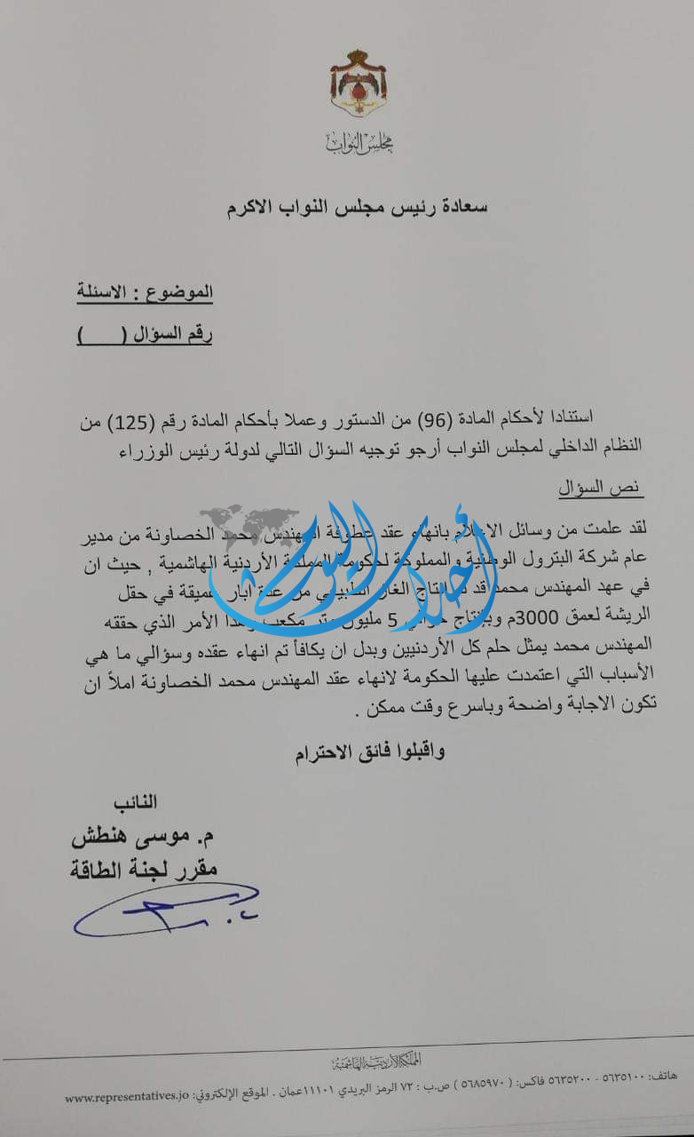وذكر هنطش في سؤاله الذي وصل "أحداث اليوم" أنّ المهندس محمد الخصاونة أنتج في عهده 5 مليون متر مكعب من الغاز الطبيعي ما يؤكد إنجازه وضرورة مكافأته لا إنهاء عقده من قبل مدير عام الشركة التابعة للحكومة.
