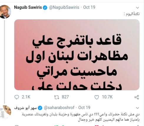 رجل الأعمال المصري نجیب ساويرس لم يحترم معناة الشعب اللبناني، وقیمة المظاھرات التي يقومون بھا، وقرر السخرية منھم من خلال تغريدة نشرھا، قال فیھا: نكتة الیوم: (قاعد باتفرج علي مظاھرات لبنان أول ماحسیت مراتي دخلت حولت علي حرب الیمن).