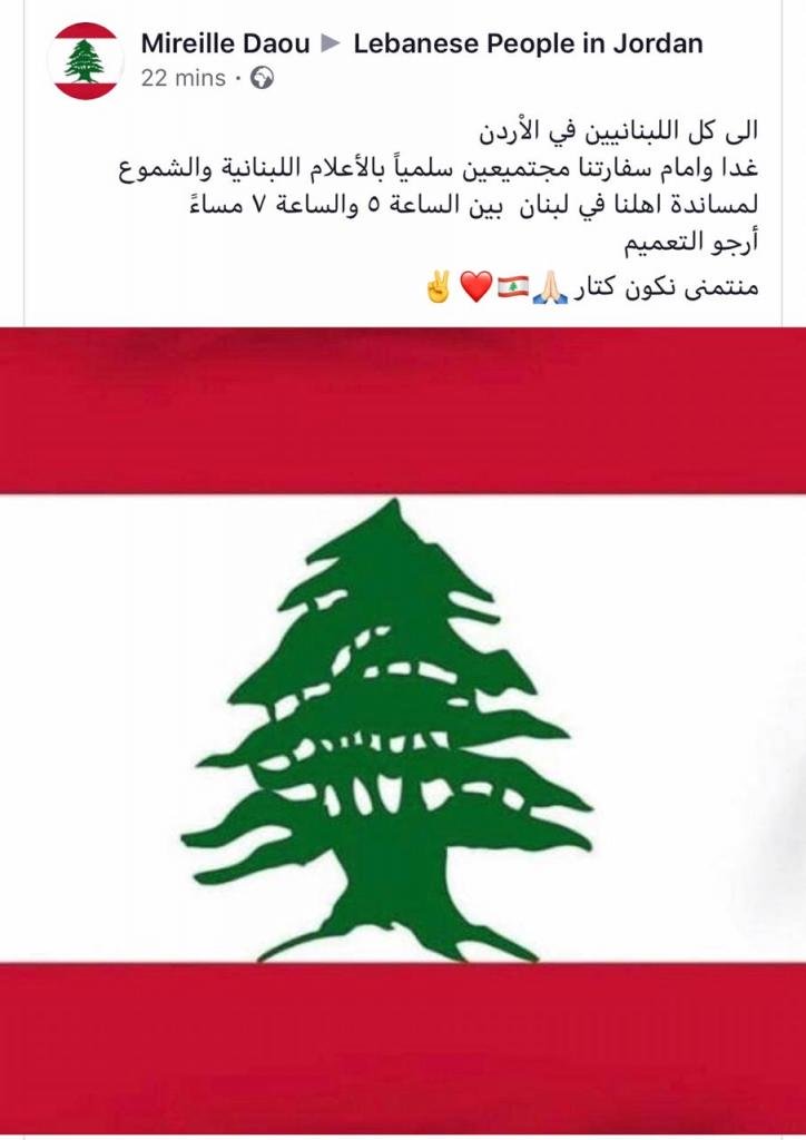 وقالت الناشطة "ميراي ضو" في منشور لها عبر موقع التواصل الاجتماعي فيسبوك في صفحة "الشعب اللبناني في الأردن" : "الى كل اللبنانيين في الاردن غدا وامام سفارتنا مجتميعين