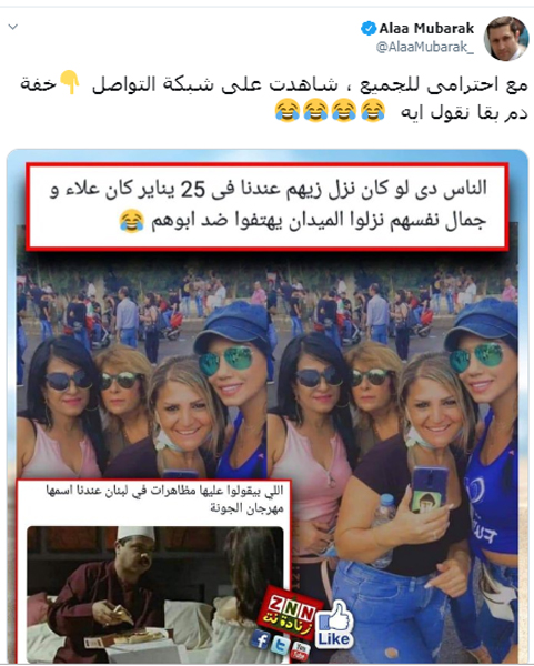 ولذلك فؤجي متابعي علاء مبارك، عند نشره لصورة لجميلات لبنان أثناء مشاركتهم في التظاهرات التي تشهدها لبنان منذ عدة أيام، مرفقة بـ"كوميك" مضحك، كتب عليها "الناس ديه لو كان نزل زيهم في 25 يناير كان علاء وجمال نفسهم نزلوا الميدان يهتفوا ضد أبوهم".