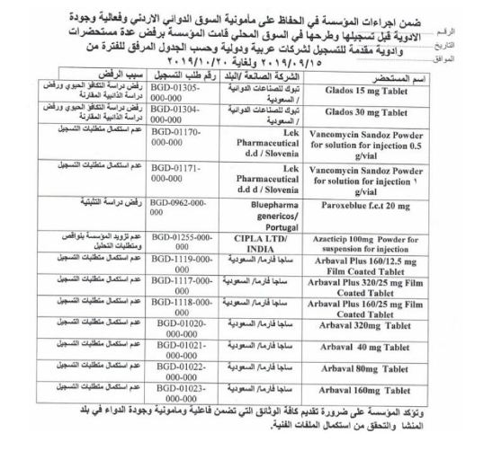 رفضت المؤسسة العامة للغذاء والدواء (15) مستحضر دوائي ولم تسجلها ضمن قائمة الادوية المصرح ببيعها بالاسواق الاردنية لنقص في بيانات تسجيلها .