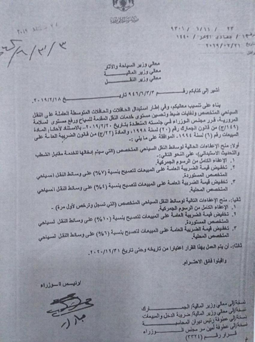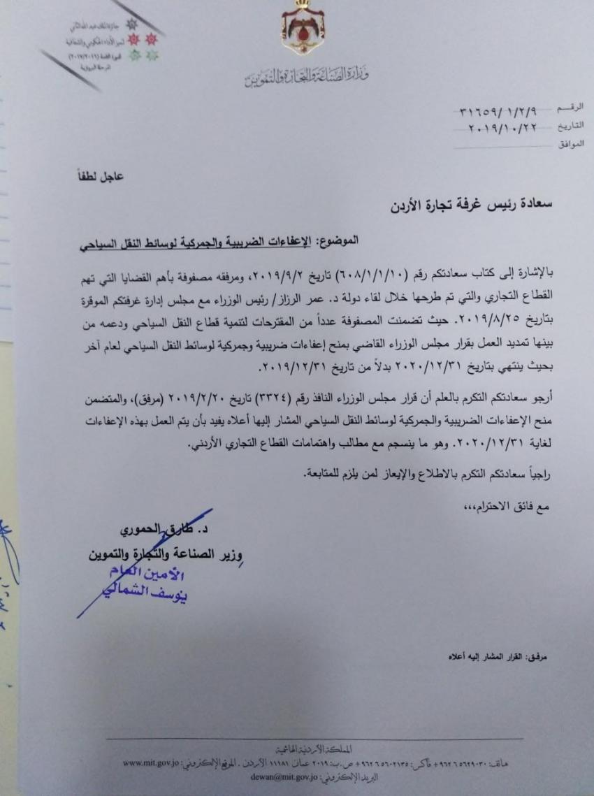 ويأتي قرار وزير الصناعة عقب موافقة مجلس الوزراء على هذا القرار إثر اجتماع بين غرفة تجارة الأردن ورئيس الوزراء قدمت خلاله الغرفة مصفوفة من القضايا التي تهم القطاع التجاري كان من بينها إعفاء وسائط النقل السياحي.