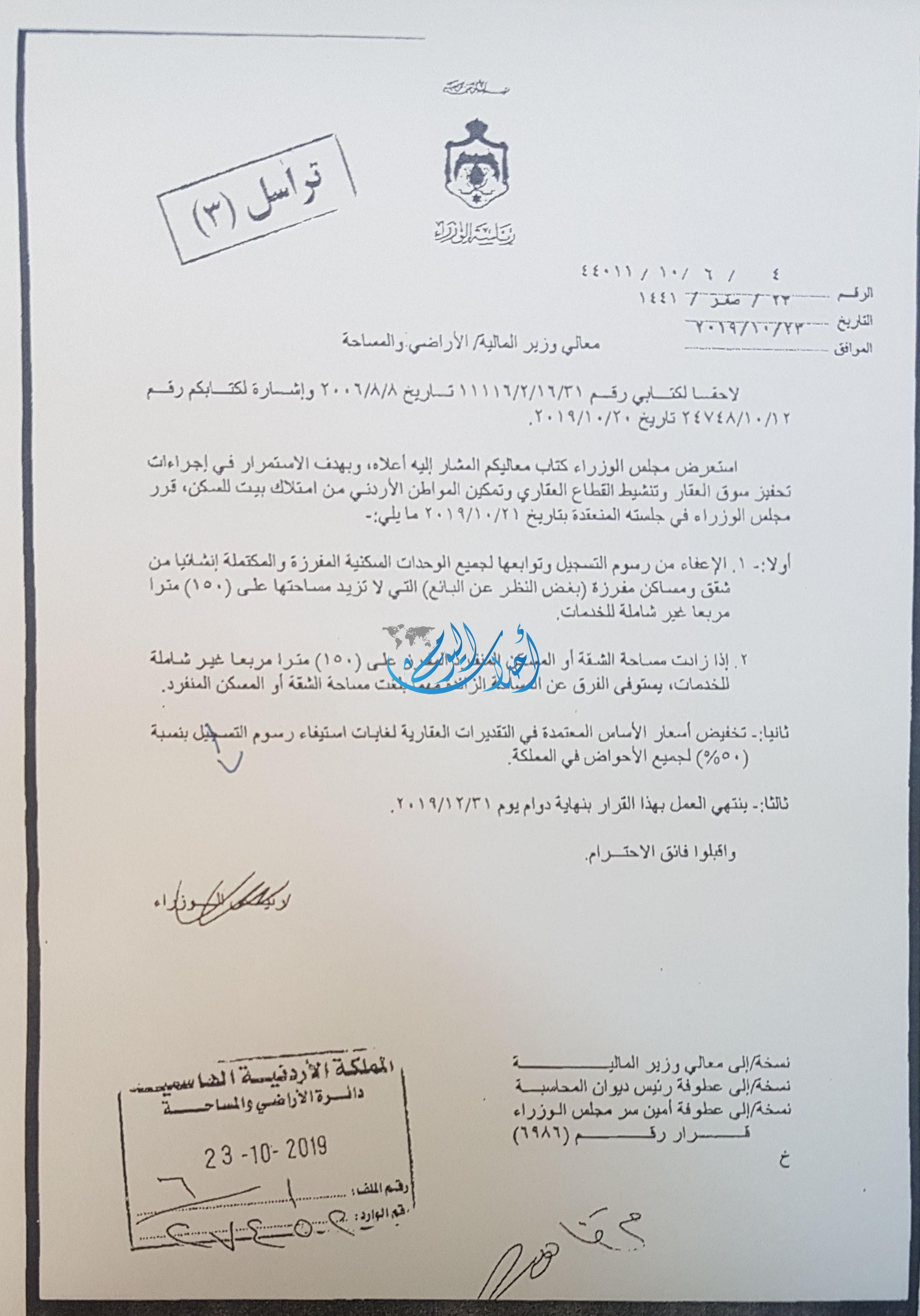 وأوضح الكتاب الذي حصلت "أحداث اليوم" على نسخة عنه أنّ الحكومة وافقت على تخفيض أسعار الأساس المعتمدة في التقديرات العقارية لغايات استيفاء الرسوم 50% لجميع أحواض المملكة.
