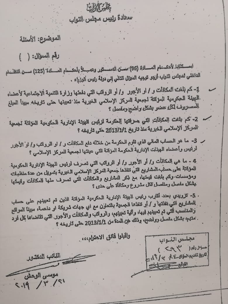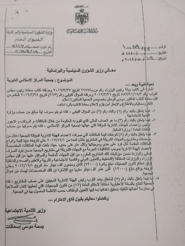 أحداث اليوم - كشف سؤال نيابي وجهه النائب موسى الوحش لوزيرة التنمية الاجتماعية عن صرف الحكومة لمئات آلاف الدنانير مكافآت لرئيس وأعضاء الهيئة الإدارية المؤقتة لجمعية المركز الإسلامي الخيرية.