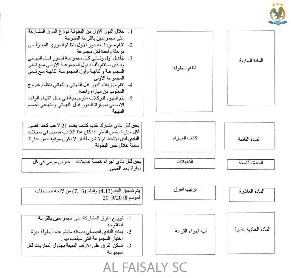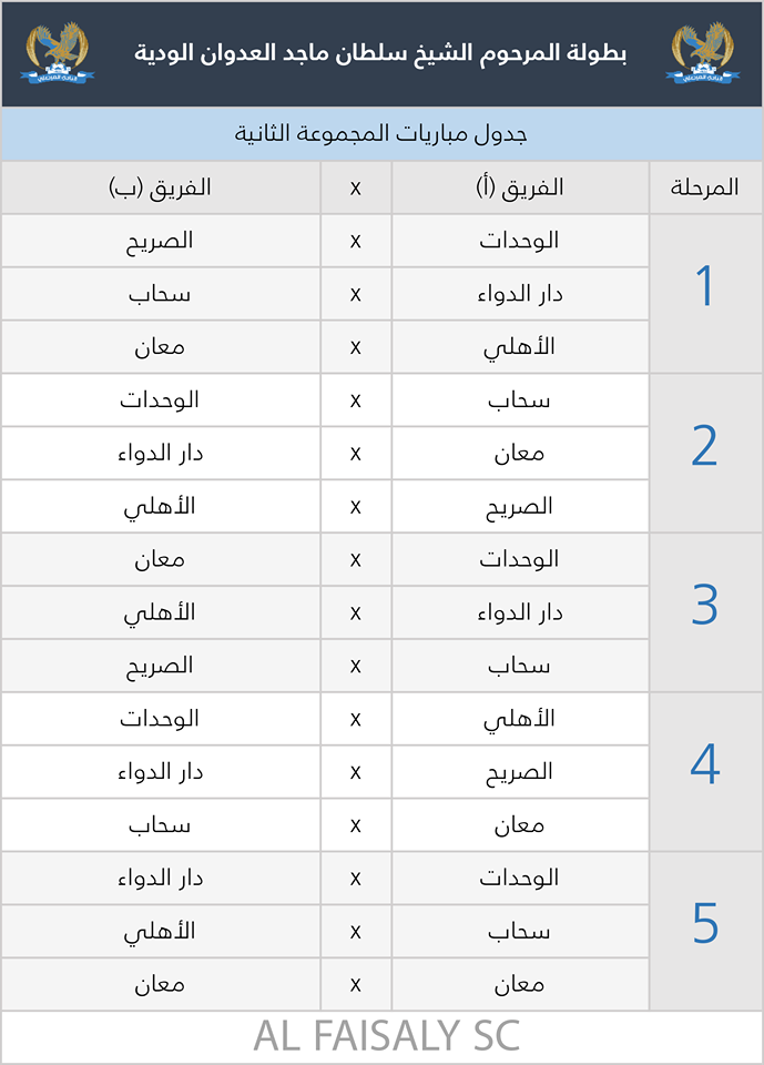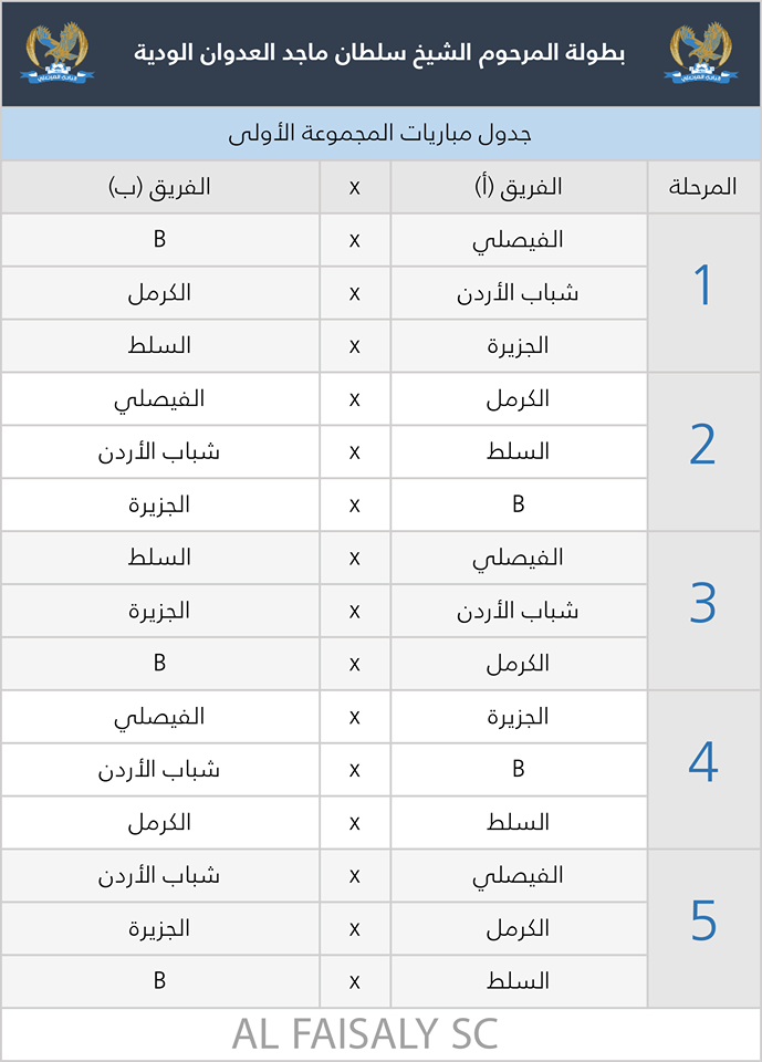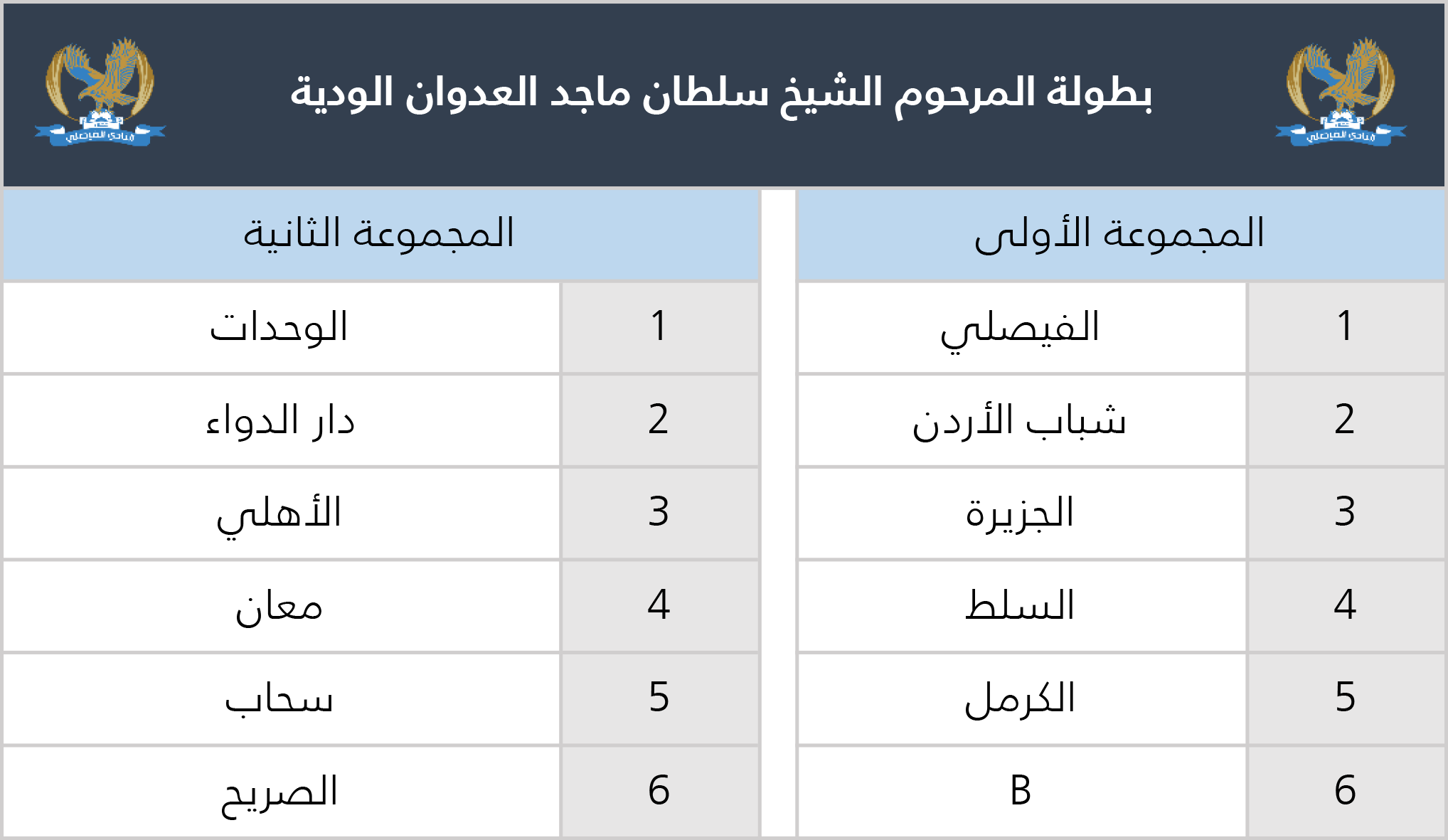وجرى توزيع الفرق المشاركة على مجموعتين بحيث ضمت مجموعة الفيصلي 5 فرق فيما ضمت المجموعة الثانية 6 فرق.