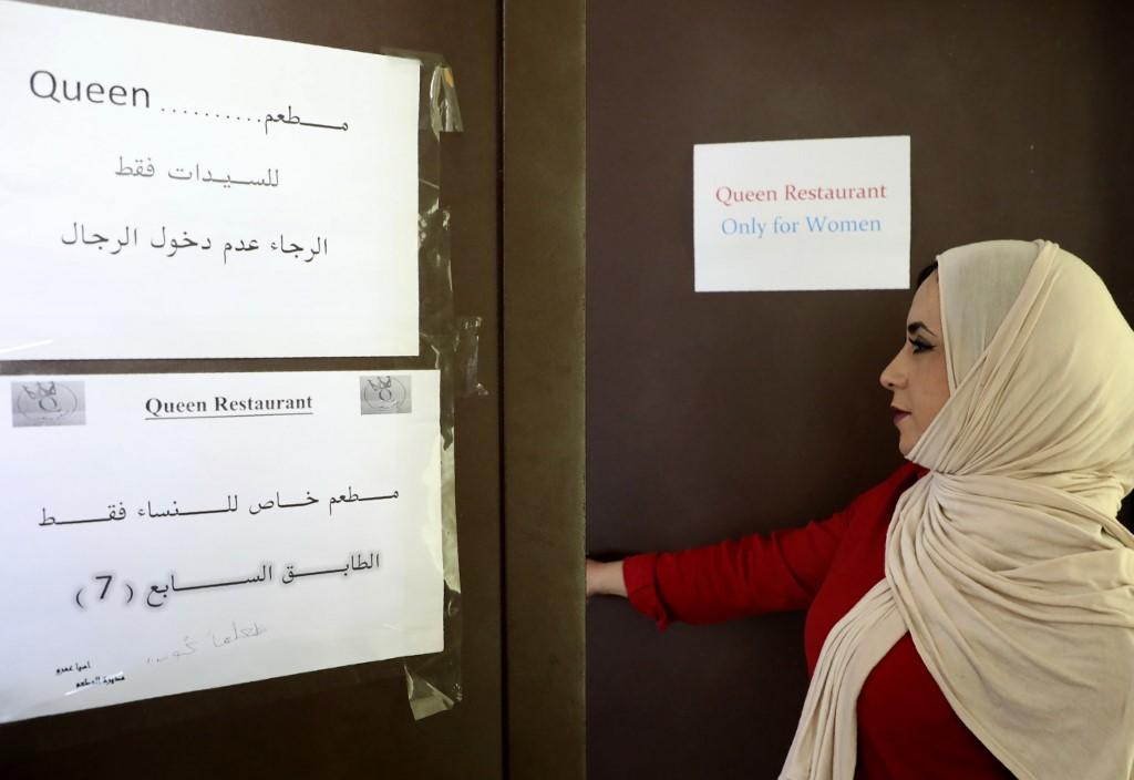 (شابة فلسطينية قبل دخولها إلى مطعم الملكة للنساء فقط بالقرب من مدينة الخليل في الضفة الغربية المحتلة/ أ ف ب)