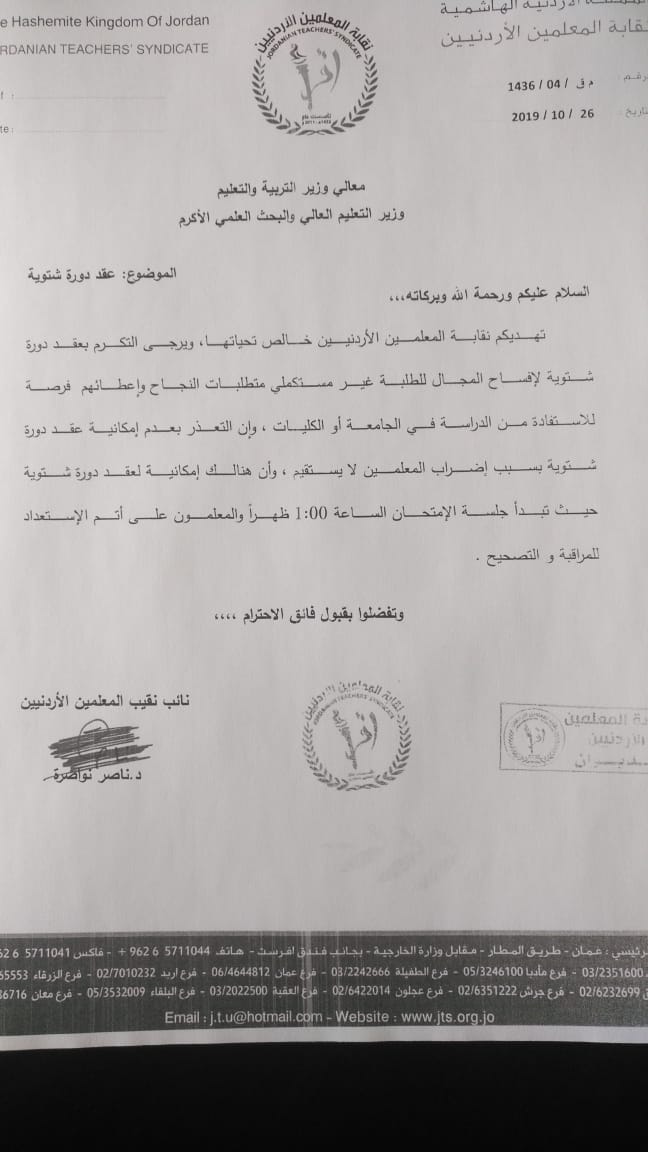 وأوضحت النقابة في كتاب رسمي أن التعذر بعدم إمكانية عقد دورة شتوية بسبب إضراب المعلمين لا يستقيم، وأن هناك إمكانية لعقد دورة شتوية، إذ تبدأ جلسة الامتحان الساعة الواحدة ظهرًا، مؤكدة استعداد المعلمين للمراقبة والتصحيح.