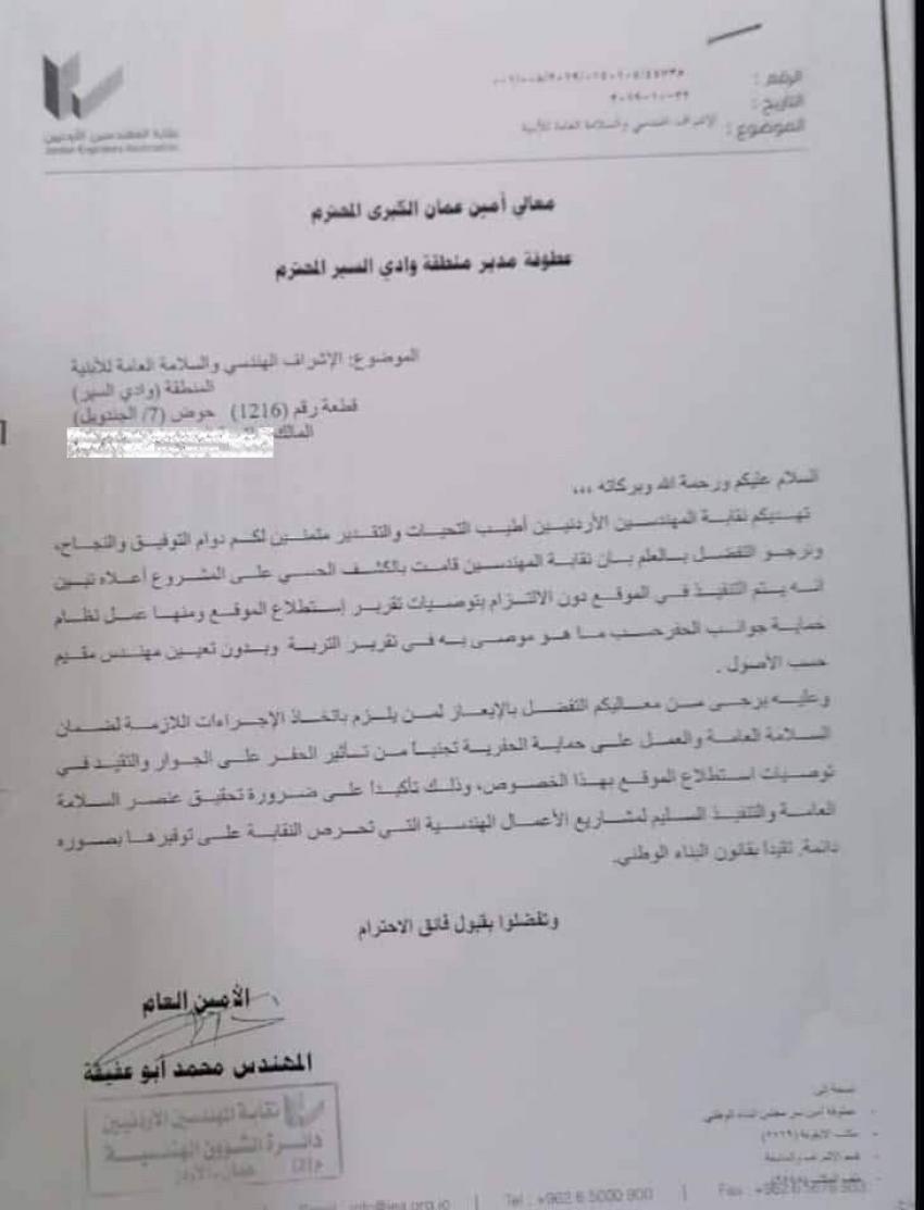 أحداث اليوم - أظهر كتاب موجه من نقابة المهندسين الأردنيين إلى مدير منطقة وادي السير في أمانة عمان الكبرى، تحذير النقابة من تنفيذ المشروع الذي تسبب بوفاة شخص ومحاصرة اثنين بسبب انهيار الجدار الاستنادي في منطقة البيادر.