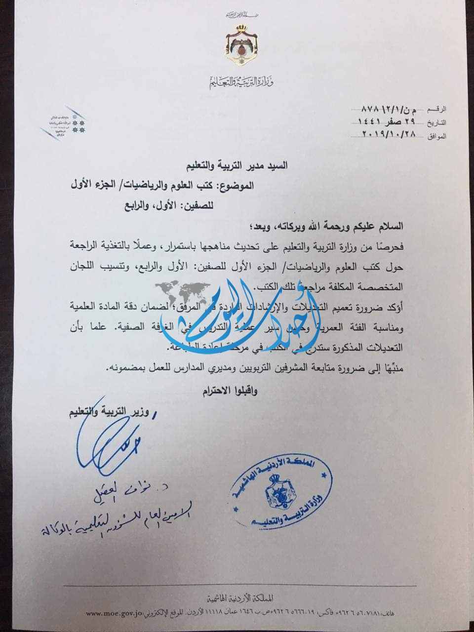 وطلب وزير التربية والتعليم في وثيقة موقعة اليوم الاثنين 28 /10/2019 بتعميم التعديلات والارشادات الواردة في المرفق لضمان دقة المادة العلمية ومناسبتها الفئة العمرية وحسن سير عملية التدريس في الغرفة الصفية، مشيرة الى ان هذه التعديلات ستدرج في الكتب في مرحلة إعادة الطباعة.