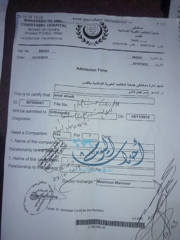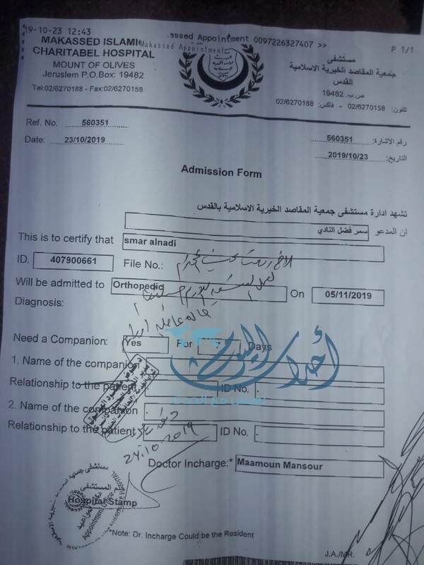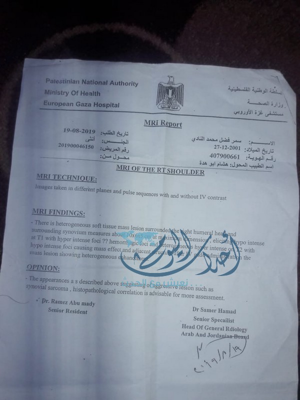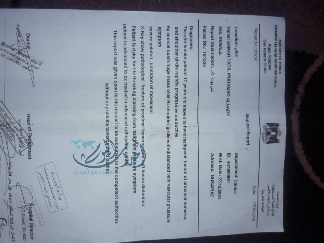 وذكروا لـ"أحداث اليوم"، أن المريضة سمر النادي (18 عاما) وهي من سكان قطاع غزة تعاني من مرض سرطان العظم منذ قرابة ستة شهور.