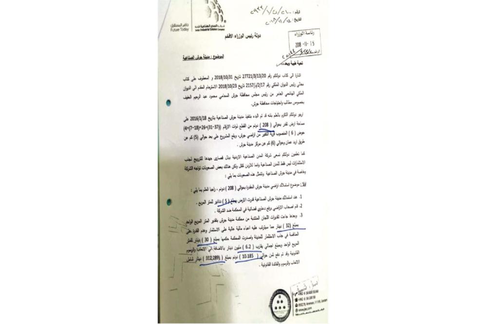 وفي كتاب موجه من شركة المدن الصناعية إلى رئيس الوزراء بتاريخ 15/11/2018، حصلت الرأي على نسخة منه حول المعيقات التي تواجه مشروع المدينة الصناعية في جرش اوضح الكتاب أن الحكومة بدأت بتنفيذ المشروع بتاريخ18/1/2016 على مساحة تقدر ب 208 دونمات من اراضي قرية الكفير، مبينًا أن سعر المتر قدر في بداية المشروع ب 5 دنانير وتم الاستملاك ليرفع بعدها اصحاب الاراضي دعاوى في المحكمة ضد الشركة، وجاءت تقديرات اللجان التي انتدبتها المحكمة ب 32 دينارًا للمتر وصدر قرار عن المحكمة ب 30 دينارًا للمتر المربع مما يرفع من كلفة الارض الى ستة اضعاف اي من مليون و40 الف دينار الى نحو ستة ملايين و200 الف دينار الامر ال?ي يرتب اعباء مالية كبيرة على الشركة ويحد من قدرتها على المنافسة بجلب المستثمرين للمدينة.