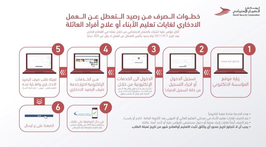 وبين أنه إذا كان التقدم للصرف لغايات التعليم العالي بكل مراحله وهو التعليم الذي لا تقل مدته عن سنة دراسية بعد شهادة الثانوية العامة أو ما يعادلها يتوجب على المؤمن عليه ارفاق وثيقة اثبات طالب باللغة العربية أو الإنجليزية موقعة ومختومة من جهة التعليم أو وصل مالي للدفع عن الفصل الدراسي عند تقديم الطلب، أما إذا كانت غايات الصرف للتعليم المهني وهو التعليم لغايات تأهيل المتدربين لوظائف أو مهن بمختلف المستويات ما بعد مرحلة الثانوية العامة (ناجح/ راسب) يتعين عليه ارفاق كتاب اثبات من جهة اصدار الشهادة المهنية بأنه مسجل لغايات الحصول على الشهادة أو وصل مالي بالدفع, على أن لا يكون مضى ((30 يوماً على تاريخ إصدار كتب الإثبات لغايات التعليم.