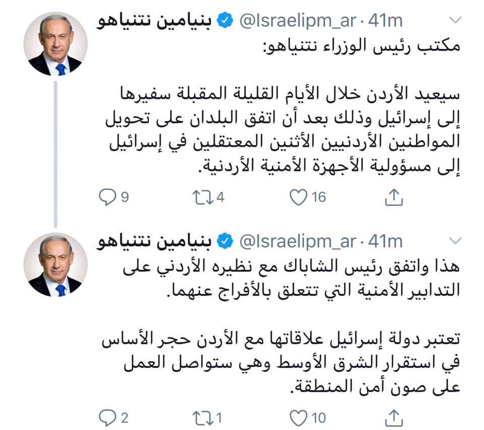 وأضاف المكتب عبر حساب نتنياهو الرسمي في تويتر أن "رئيس الشاباك اتفق مع الأردن على التدابير المتعلقة بالإفراج عن المعتقلين الأردنيين في إسرائيل هبة، وعبد الرحمن."