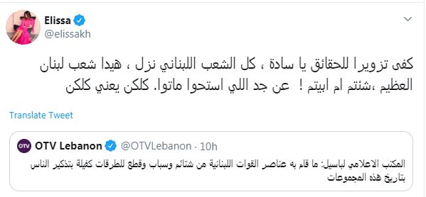 بتاريخ ھذه المجموعات“ ھذا التصريح استفز النجمة اللبنانیة إلیسا كما باقي الثورا الذين نزلوا إلى الشراع تحت راية العلم اللبنانیة لا الإنتماءات السیاسیة والأحزاب، ووجھت كلامھا لھم قائلة: ”كفى تزويرا للحقائق يا سادة ، كل الشعب اللبناني نزل ، ھیدا شعب لبنان العظیم ،شئتم ام ابیتم ! عن جد اللي استحوا ماتوا.