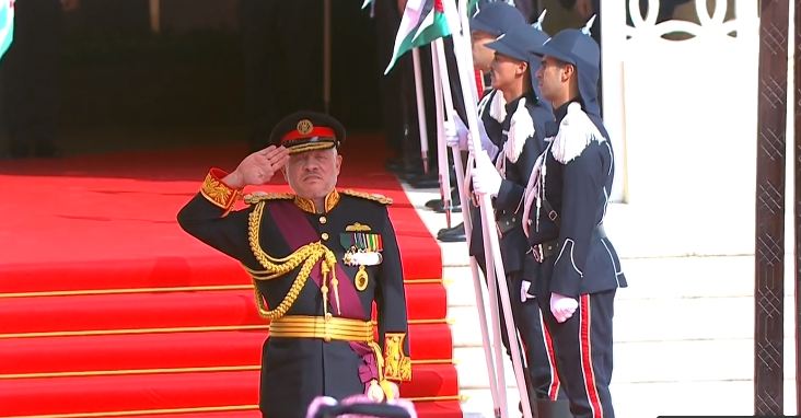 وكانت قد اقيمت مراسم التشريفات الملكية في باحة مجلس الأمة، وعزفت موسيقات القوات المسلحة النشيد الوطني.
