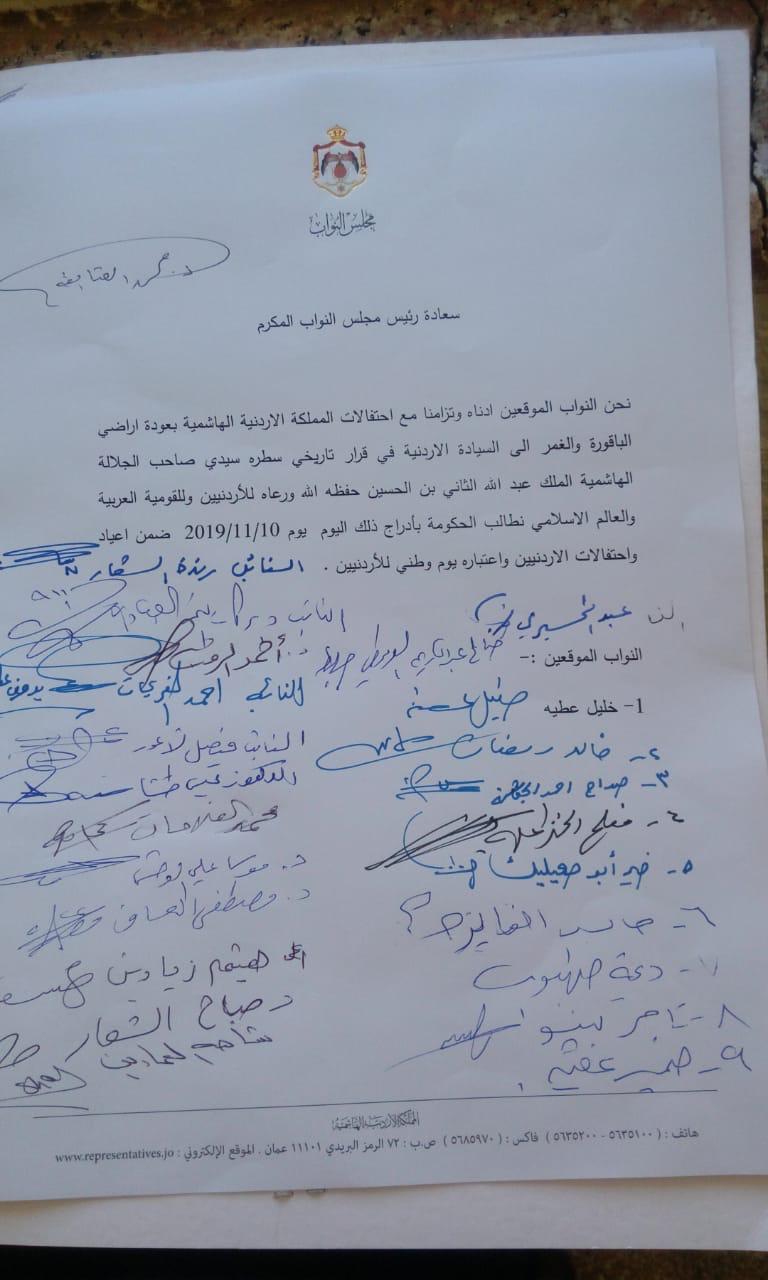 "نحن النواب الموقعين ادناه وتزامنا مع احتفالات المملكة الاردنية الهاشمية بعودة اراضي الباقورة والغمر الى السيادة الاردنية في قرار تاريخي سطره سيدي صاحب الجلالة الهاشمية الملك عبد الله الثاني بن الحسين حفظه الله ورعاه للأردنيين وللقومية العربية والعالم الاسلامي نطالب الحكومة بأدراج ذلك اليوم يوم 10/11/2019 ضمن اعياد واحتفالات الاردنيين واعتباره يوم وطني للأردنيين"