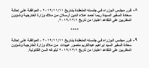 كما صدر قرار مجلس الوزراء باحالة السفير ابراهيم عبدالكريم عبيدات من ملاك وزارة الخارجية وشؤون المغتربين الى التقاعد.