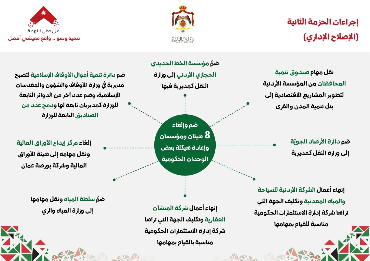 كما ضمت الحكومة مؤسسة الخط الحديدي إلى وزارة النقل ودمجت تنظيم الطاقة والمعادن مع هيئة الطاقة الذرية الأردنية. الشركة الاردنية للسياحة والمياه المعدنية، وشركة المنشئات العقارية،و صندوق تنمية المحافظات إلى بنك تنمية المدن والقرى، ودمج دائراتي الشراء الموحد واللوازم العامة بدائرة واحدة سميت دائرة المشتريات