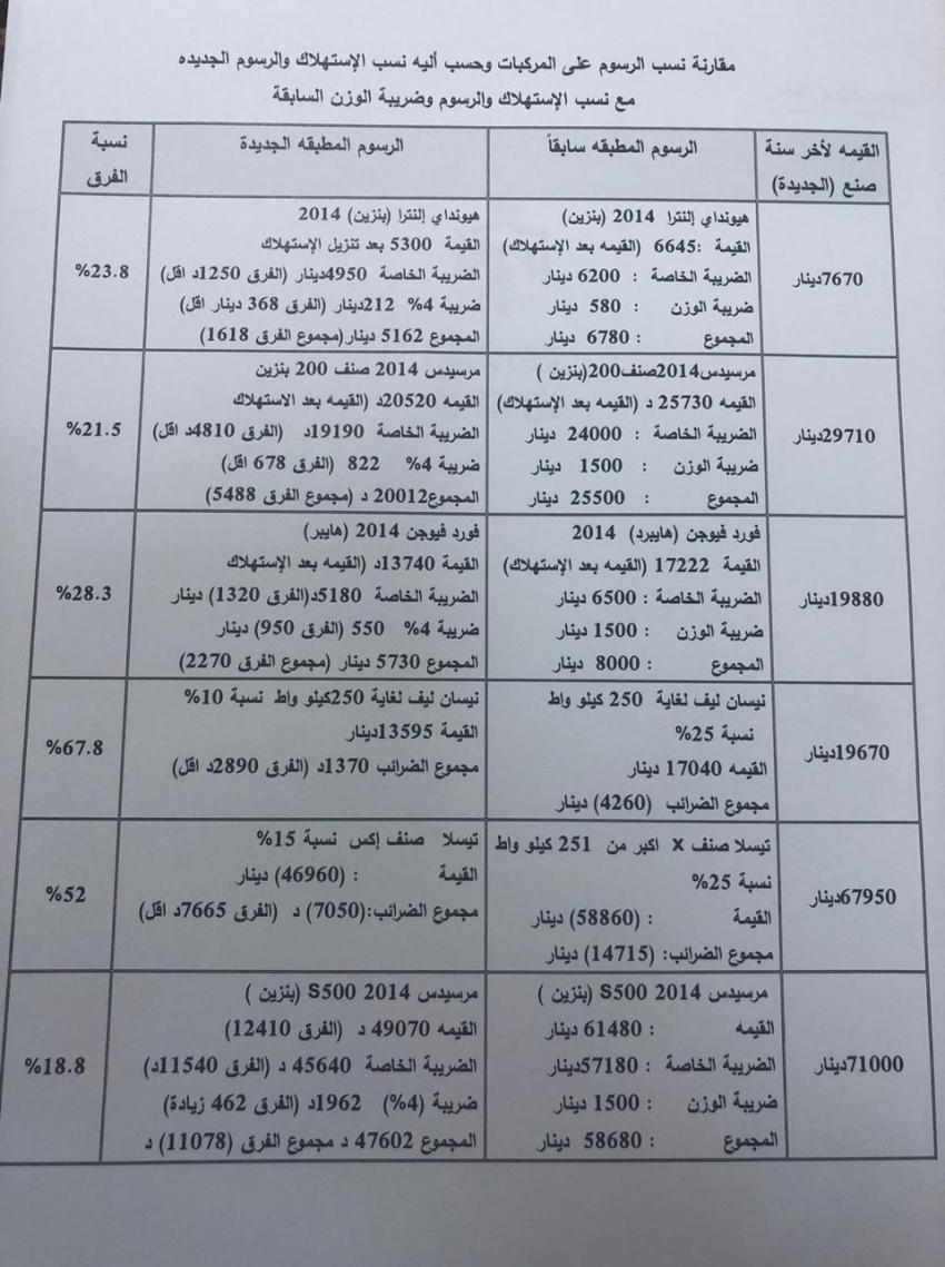 جدول توضيحي يظهر الرسوم الجديدة للسيارات