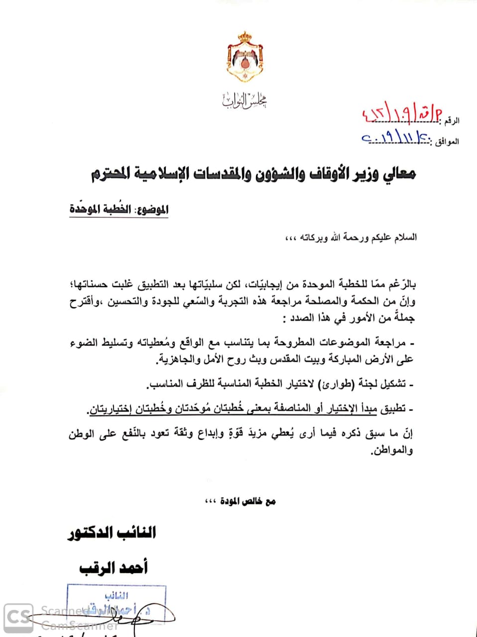 أحداث اليوم - رفع النائب الدكتور احمد الرقب كتاباً لوزير الأوقاف الدكتور محمد الخلايلة، طالب فيه مراجعة أسس الخطبة الموحدة.