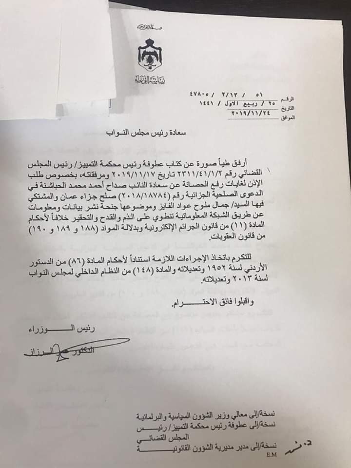 الرزاز يخاطب النواب لرفع الحصانة عن الحباشنة - وثيقة