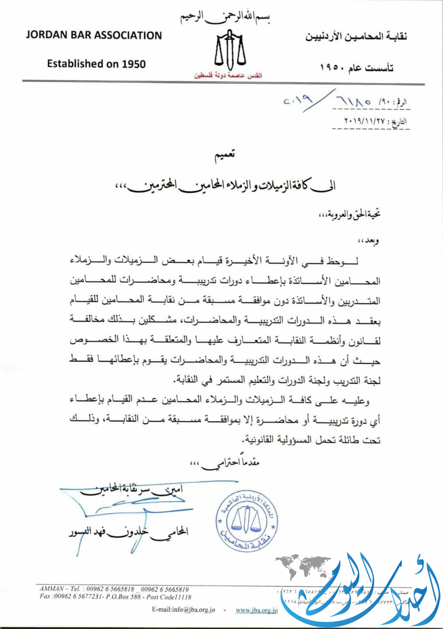 وخاطب امين سر التقابة خلدون النسور المحامين بكتاب يعتبر ذلك مخالفة لقوانين النقابة التي تخصص هذه المهمة لللجنة التدريب والتعليم التابعة لها.