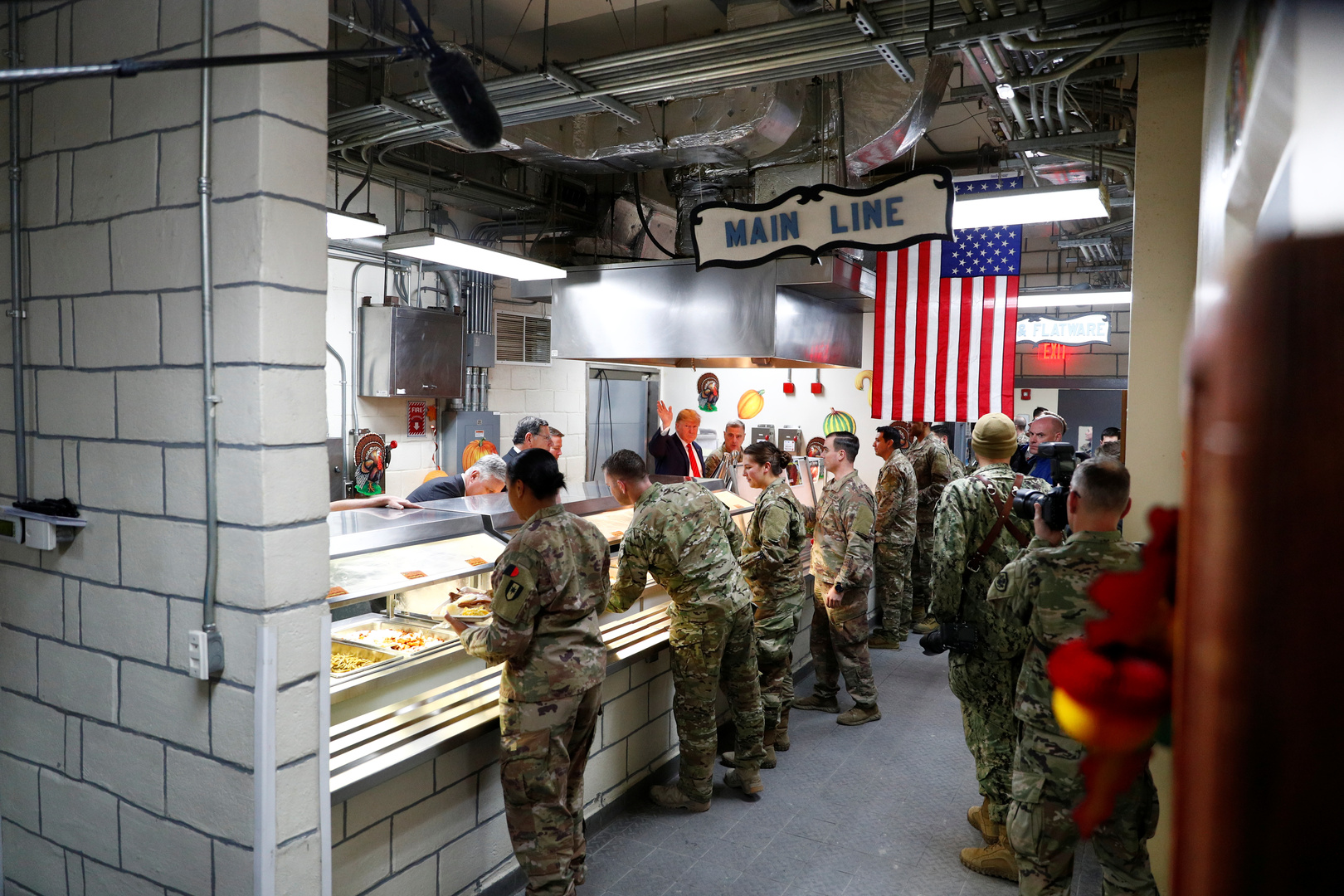 ومن ثم جلس ترامب مع بعض العسكريين لتناول غداء العيد معهم، والذي تكون من الديك الرومي والبطاطس المهروسة وخبز الذرة، وتحدث معهم والتقطوا معا صورا تذكارية.
