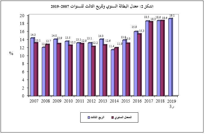 • بلغ معدل البطالة (19.1%) بارتفاع مقداره 0.5 عن الربع الثالث من عام 2018.