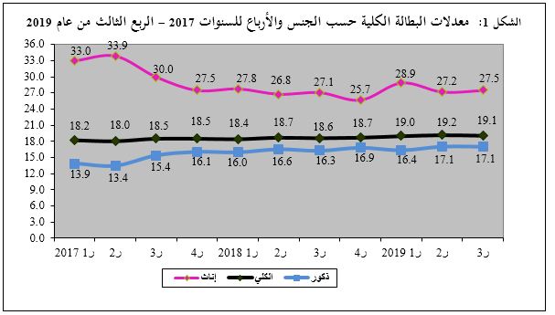 • بلغ معدل البطالة للذكور (17.1%) مقابل (27.5%) للإناث، ويتضح أنّ معدل البطالة قد ارتفع للذكور بمقدار0.8 نقطة مئوية وارتفع للإناث بمقدار 0.4 نقطة مئوية مقارنة بالربع الثالث من عام 2018.