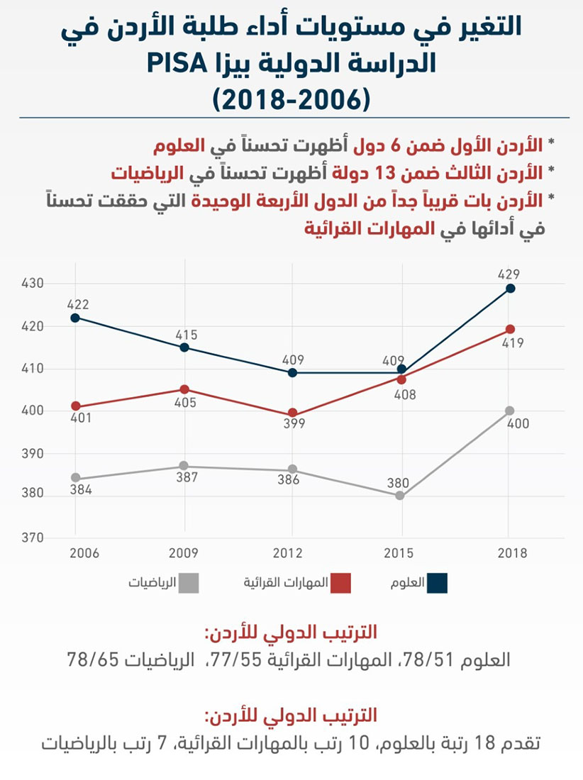 أحداث اليوم - تقدم الأردن في نتائج دراسة البرنامج الدولي لتقييم الطلبة (PISA 2018)، من خلال التحسن الواضح في متوسط أداء الطلبة الأردنيين في مباحث العلوم والرياضيات والقرائية.
