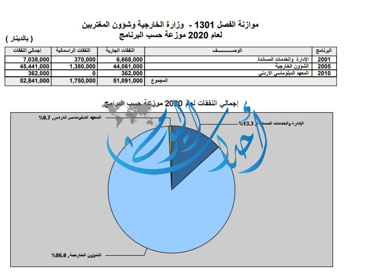 ياسر شطناوي - أظهرت بيانات موازنة 2020 أن الحكومة خصصت النفقات الجارية والرأسمالية المقدرة لوزارة الخارجية وشؤون المغتربين بمبلغ 52.841.000 دينار.