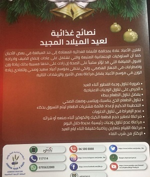 ودعت النشرة الى ضرورة الالتزام بالعادات السليمة والنظام الغذائي الصحي أثناء عطلة عيد الميلاد ورأس السنة الميلادية والتخطيط الحكيم لتسوق حلويات العيد و مراعاة أهمية اتباع أسس حفظ الأغذية وتداولها من حيث درجات الحرارة والأواني المستخدمة وضمان عدم تلوثها .