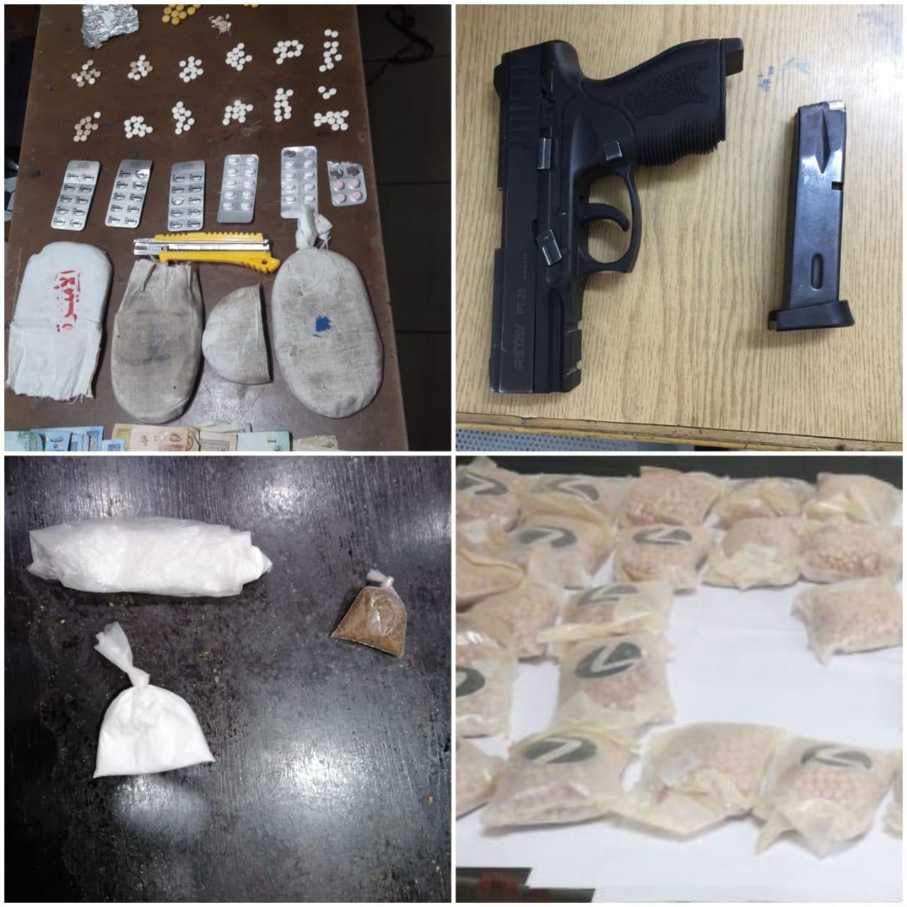 وفي 5 قضايا منفصلة في لواء الرصيفة والعاصمة ضبطت خمسة أسلحة نارية بحوزة خمسة اشخاص وضبط بحوزة ثلاثة منهم كميات متفرقة من المواد المخدرة .
