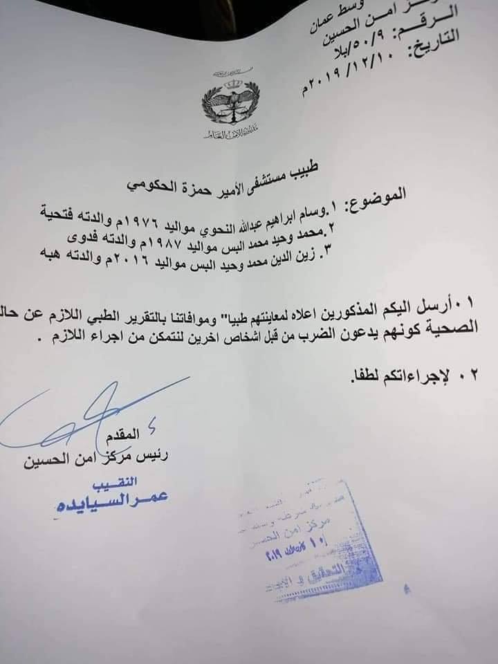 ويسعى عليان إلى إقناع المشتكين، وسام النحوي ومحمد البس ونجله الطفل زين الدين البس، بإسقاط الشكوى التي تقدموا بها إلى مركز أمن الحسين، وحصلوا على تقارير طبية من مستشفى الأمير حمزة، تُبيّن معاناتهم من رضوض في الكتف وآلام بالرقبة.