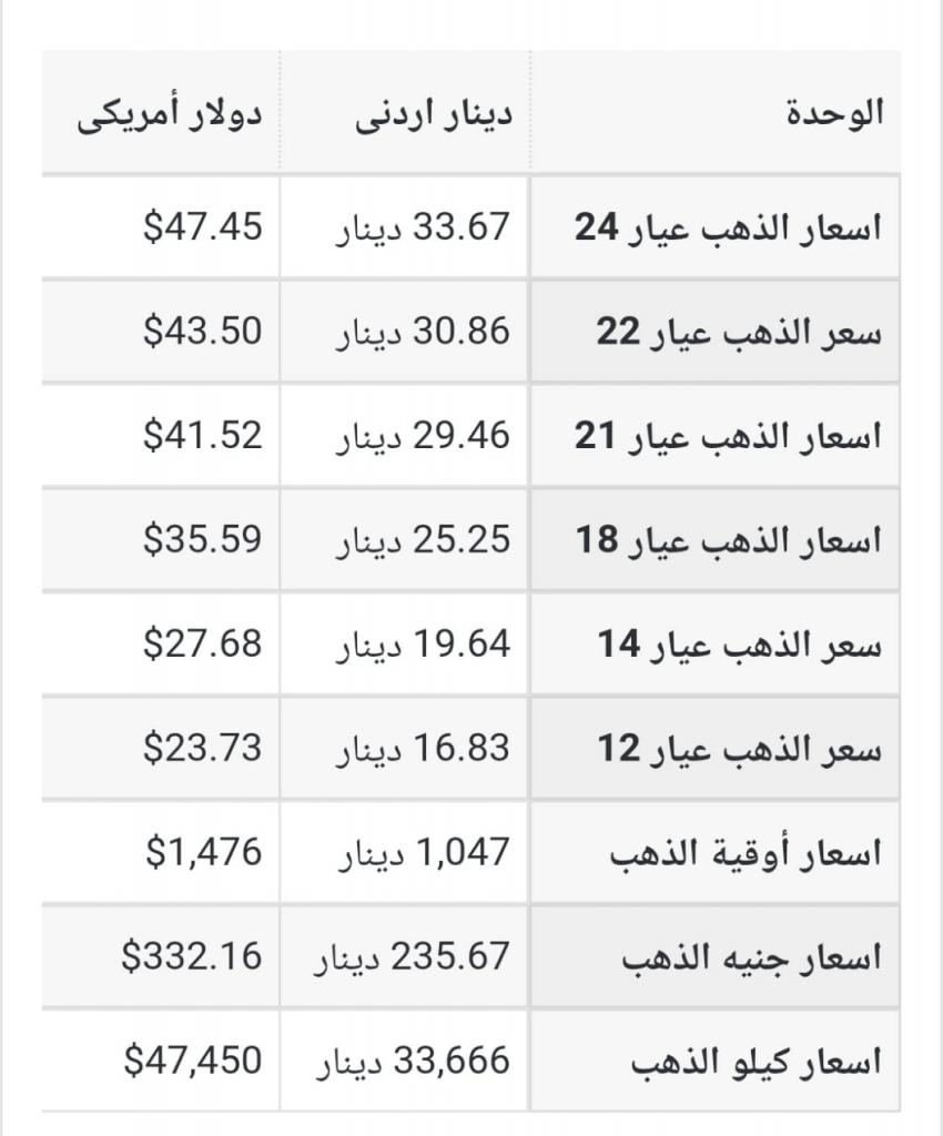 ارتفاع اسعار الذهب محليا 40 قرشا .. وعيار الـ 21 عند 80.70 دينارا