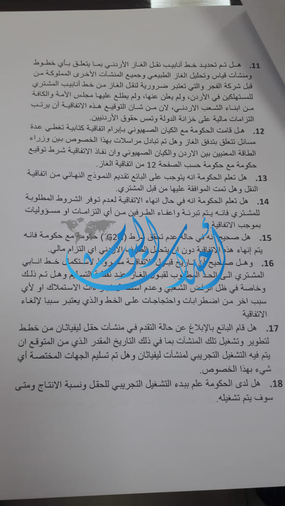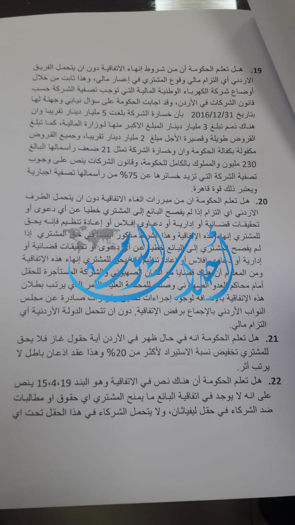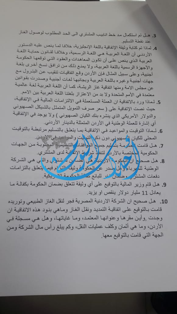 1.هل لدى الحكومة علم بإن المحكمة المركزية العليا في القدس قد اصدرت يوم الثلاثاء الماضي قراراً بمنع الشُركاء في حقل ليفياثان من العمل بسبب شكاوى مقدمة ضد انتاج البترول في هذا الحقل، مما يستوجب تطبيق النص الوارد في الاتفاقية، وهذا القرار سبب مقدم على طبق من ذهب على وجوب الغاء الاتفاقية من جانبنا دون ان يترتب أي التزام مالي على الجانب الاردني، وهل لدى الحكومة نية بتفعيل هذا النص.
