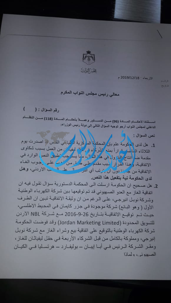 2.هل صحيح ان الحكومة ارسلت الى المحكمة الدستورية سؤال تقول فيه ان اتفاقية الغاز مع العدو الصهيوني قد تم توقيعها بين شركة الكهرباء الوطنية وشركة نوبل انيرجي، على الرغم من ان وثيقة الاتفاقية تبين ان الطرف الأول ( وهو البائع) شركة موجودة في جزر كايمان في المحيط الاطلسي، حيث تم توقيع الاتفاقية بتاريخ 26-9-2016 مع شركة NBL الاردن للتسويق المحدودة (Jordan Marketing Limited) وقد فوضت الحكومة شركة الكهرباء الوطنية بالتوقيع على اتفاقية بيع وشراء الغاز مع شركة نوبل إنيرجي، ومملوكة بالكامل من قبل الشركاء الأربعة في حقل ليفياثان للغاز، ومقر الشركة الرئيس في أبا إيبان – بوليفارد – هرتسليا في الكيان الصهيوني، ولماذا.